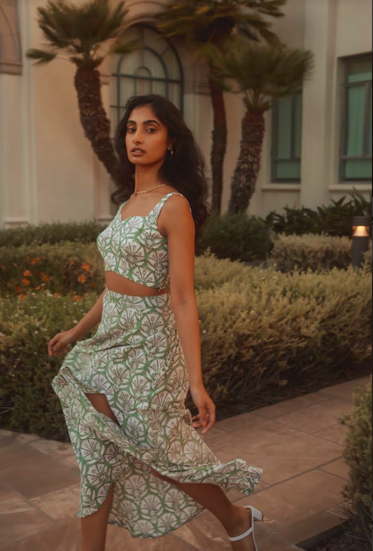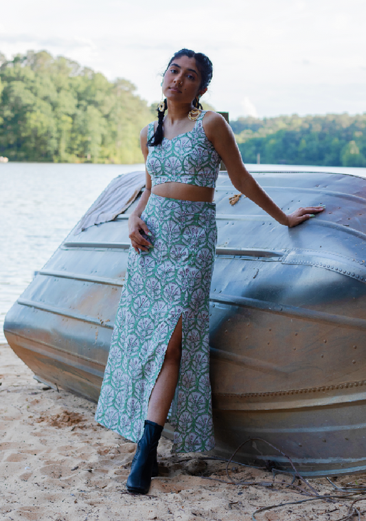 Jade Green Floral Block Printed Matching Skirt Set (Top)