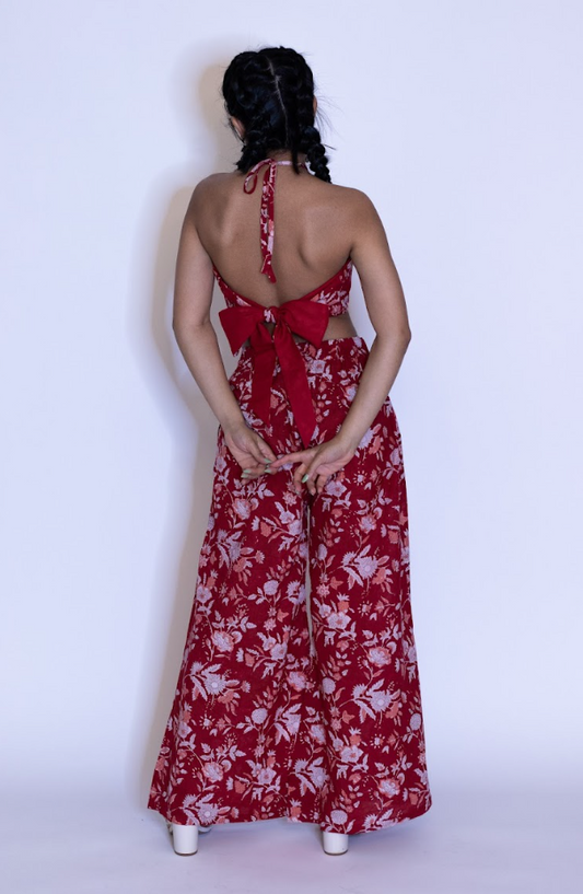 Red Floral Hand Block Printed Wide Leg Pant Set (Pants)