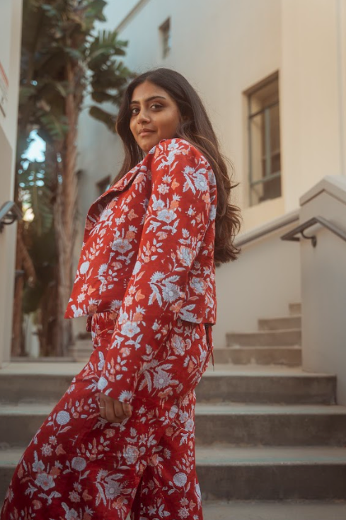 Red Floral Hand Block Printed Wide Leg Pant Set (Top)