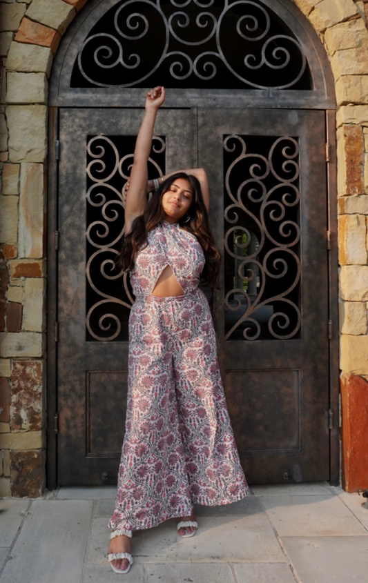 Hand Block Printed Halterneck Cutout Jumpsuit